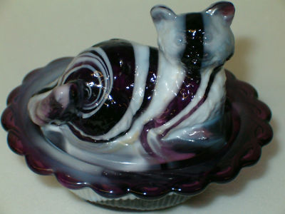 PURPLE & MILK SLAG GLASS CAT KITTEN ON NEST BASKET SALT