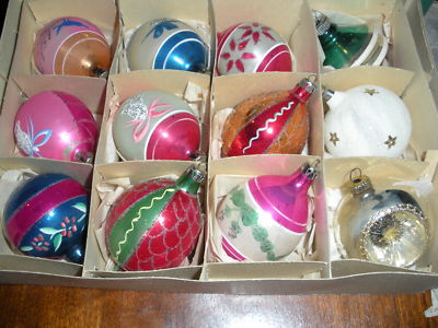 Title (ebay affiliate link): Mint in Box 12 vintage Hand Painted glass bulbs! NICE!