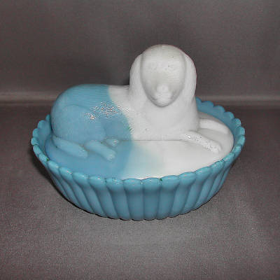 Westmoreland Blue White Milk Glass Dog on Basket Nest