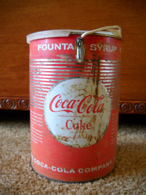 Title (ebay affiliate link): One Gallon Coca-Cola Soda Fountain Syrup Can Tin Bottle