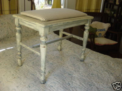 Title (ebay affiliate link): ANTQ SHABBY BLUE BENCH W/NEW TICKING COVER-VANITY/STOOL