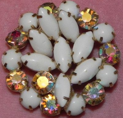 VINTAGE WHITE MILK GLASS & AURORA RHINESTONE PIN BROOCH