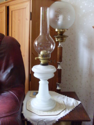 VICTORIAN OIL LAMP DUPLEX MILK WHITE FONT AND STEM