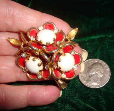 Vintage White Milk Glass Rhinestone Red Flower Brooch