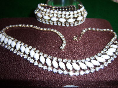 Vintage Rhinestone & Milk Glass Necklace & Bracelet ~~