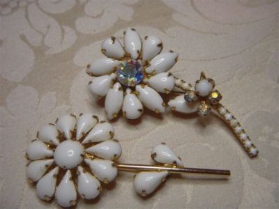 2 VINTAGE RHINESTONE MILKGLASS FLOWER PINS JULIANA