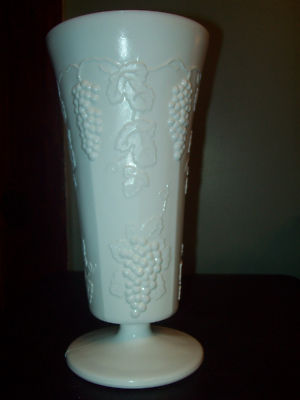 10 INCH MILK GLASS VASE W/ GRAPES AND VINES VERY DECO