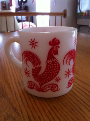 VINTAGE HAZEL ATLAS RED ROOSTER COFFEE MUG MILK GLASS