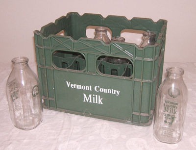 5 Old dairy milk bottles qt w crate Vermont NR lot
