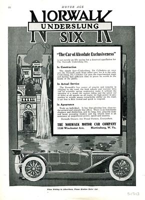 Title (ebay affiliate link): 1913 NORWALK Underslung 6 Motor CAR AD. Martinsburg WVA