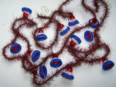 Title (ebay affiliate link): Vtg Tinsel Garland w/ Sugar Bells Patriotic R/W/B 7'6"