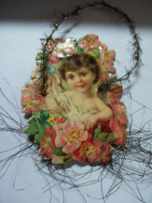 Title (ebay affiliate link): ANTIQUE TINSEL & PAPER CHRISTMAS ORNAMENT,ANGEL/FLOWERS