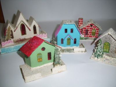 Title (ebay affiliate link): (5)Vtg PUTZ VILLAGE HOUSES w/Mica,Glitter,Trees JAPAN