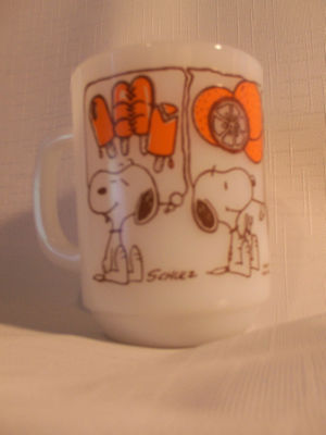 VINTAGE FIRE KING MILK GLASS SNOOPY MUG "SWEET TREATS"