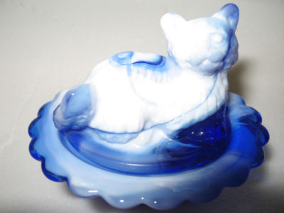COBALT & MILK SLAG GLASS CAT KITTEN ON NEST BASKET SALT