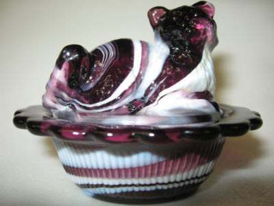 PURPLE & MILK SLAG GLASS CAT KITTEN ON NEST BASKET SALT