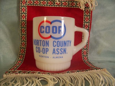VINTAGE WHITE MILK GLASS (CO-OP) COFFEE CUP, KANSAS