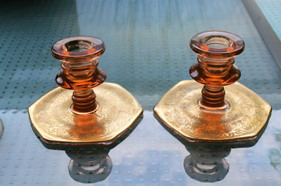 Title (ebay affiliate link): Pair Depression Glass Candle Stick Holders/Rose -w/Gold