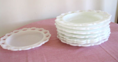 8 Lovely WHITE LACE EDGE MILK GLASS SALAD PLATES! Ex Cd