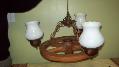 1960'S WAGON WHEEL 3 LIGHT FIXTURE MILK GLASS, COPPER