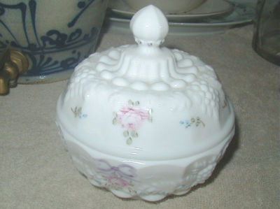 WESTMORELAND GRAPE MILK GLASS POWDER DISH ROSES & BOWS