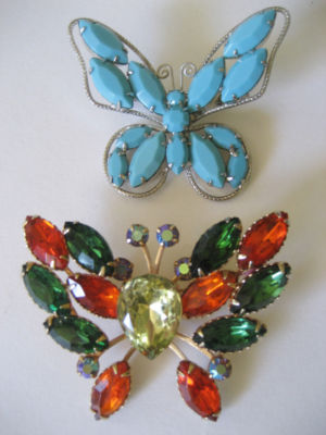 VTG rhinestone and turquoise milk glass butteryfly pins
