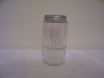 Title (ebay affiliate link): Clear Glass Ribbed Hoosier Spice Jar & Tin/Alum. Lid