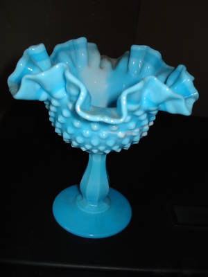 EARLY FENTON HOBNAIL BLUE MILK GLASS SCALLOPED VASE NR