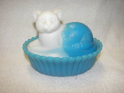 BLUE MILK GLASS - "CAT ON WIDE RIB BASE" - COVERED DISH