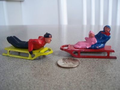 PAIR VTG XMAS LEAD FIGURES FAMILY BARCLAY W/SLEDS TOYS!