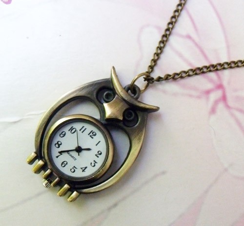 BRONZE POCKET WATCH CLOCK Owl PENDANT LONG NECKLACE