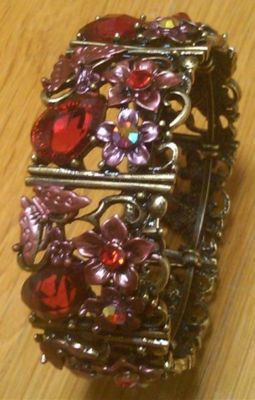 Antique Gold Tone Metal Floral Cuff with Red Stones