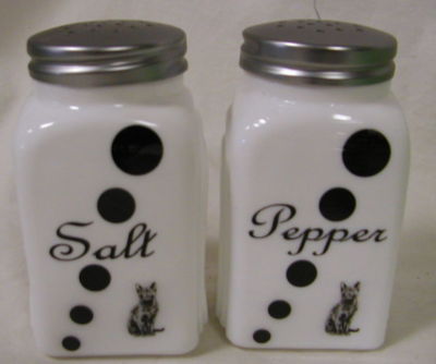 Milk Glass Salt & Pepper Shaker Set w/Black Dots & Cats