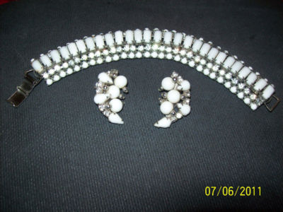 Antique Milk Glass/Rhinestone Bracelet/Earring set -NR