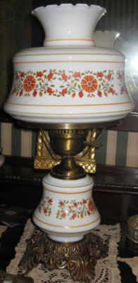 Milk glass lamp w/orangey flowers, green leaves Fenton?