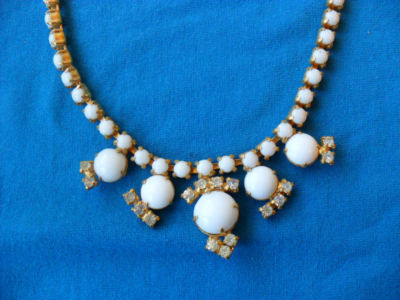 Vintage Jewelry Necklace Milkglass Rhinestones Gold Tne