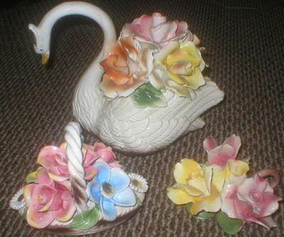 3 pcs.CAPODIMONTE SWAN,CANDLE HOLDER,FLOWER BASKET