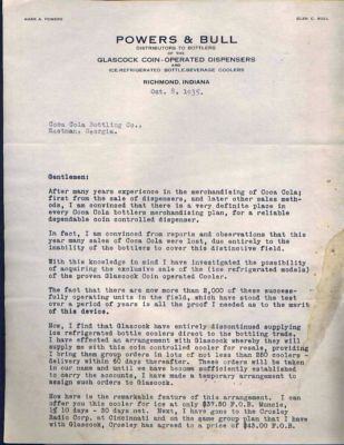 Coca Cola Coke GLASCOCK COOLER Distr. Sales Letter 1935