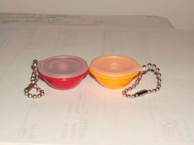 Title (ebay affiliate link): VINTAGE TUPPERWARE KEY CHAINS RED ORANGE BOWLS W/LIDS