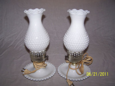 2 "VINTAGE" WHITE MILK-GLASS HOBNAIL HURRICANE LAMPS