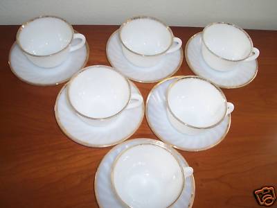 FIRE-KING Whiite Milk Glass Gold Trim Cups/Saucers~Set6