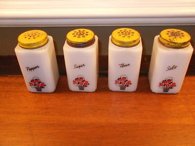 4 Tipp Milk Glass Shakers Set Yellow Tops Depression