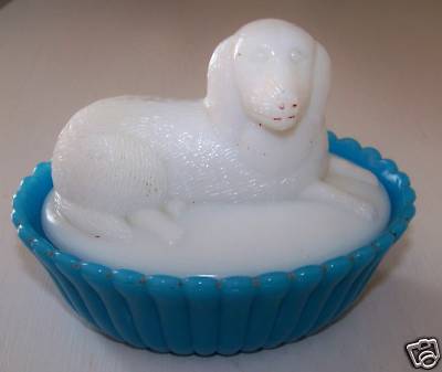 Vintage BLUE MILK GLASS Covered DOG Dish
