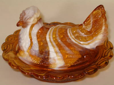 AMBER & MILK SLAG GLASS HEN CHICKEN ON NEST BASKET DISH