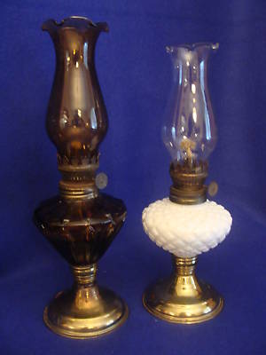 VINTAGE MINIATURE OIL LAMPS-MILK GLASS & AMBER-NOT USED