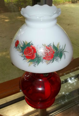 VTG RUBY RED GLASS KEROSENE OIL LAMP W MILK GLASS SHADE