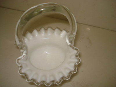 FENTON SIGNED ruffled milk glass & clear basket MINT