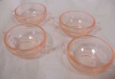 Title (ebay affiliate link): 4 Child's Miniature Depression Pink 2 Handle Soup Bowls