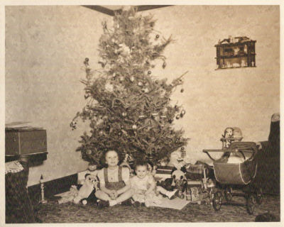Real Photo Xmas. WWII, 1940s. Toys, Huge Decorated tree
