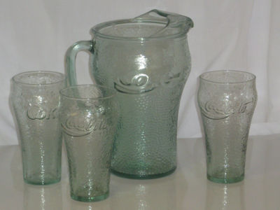 COKE PITCHER & 3 LARGE GLASSES USED